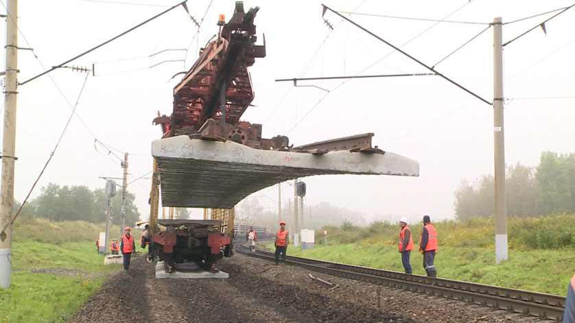 Вместо деревянных шпал уже давно используют метало-бетонные. Они значительно крепче и выдерживают большую нагрузку. 3 года назад в амурском городе Свободном наладили производство на базе убыточного предприятия. Поставки оттуда идут бесперебойно. На все работы на этом 9-километровом отрезке у путейцев 3 дня. Трудятся даже в дождь.