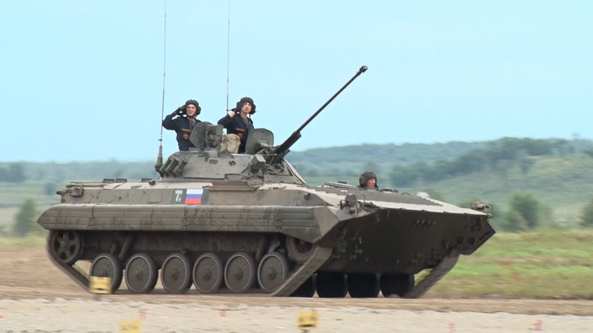 Сначала стартовали россияне. Они безупречно отстрелялись на всех 3 огневых рубежах, однако на штрафной круг всё же пришлось зайти: из-за технической неисправности машины потребовалась замена БМП. Не сразу гонку завершили и белорусы, у которых на огневом рубеже заклинило оружие. Тем не менее они смогли продолжить заезд и опередили гвинейцев, показав второе время дня. А российский экипаж финишировал с рекордом трассы — 26 минут и 43 секунды, став лидером в общем зачете.