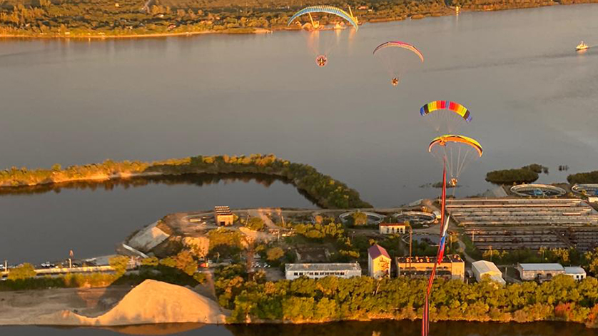 Экстремалы из Москвы и Приамурья на мотопарапланах развернули в небе над Благовещенском Георгиевскую ленту длиной 75 метров. На этих летательных аппаратах столичные спортсмены путешествуют по России и в каждом регионе устраивают воздушный парад. Акция посвящена годовщине окончания Великой Отечественной войны.