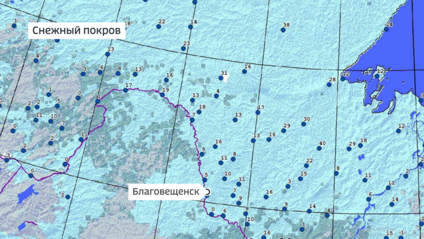 Снежный покров залегает повсеместно, но высота небольшая, и везде гораздо меньше нормальной. Максимальная высота сугробов отмечается в Селемджинском районе, но и здесь на 5-7 сантиметров меньше положенного.