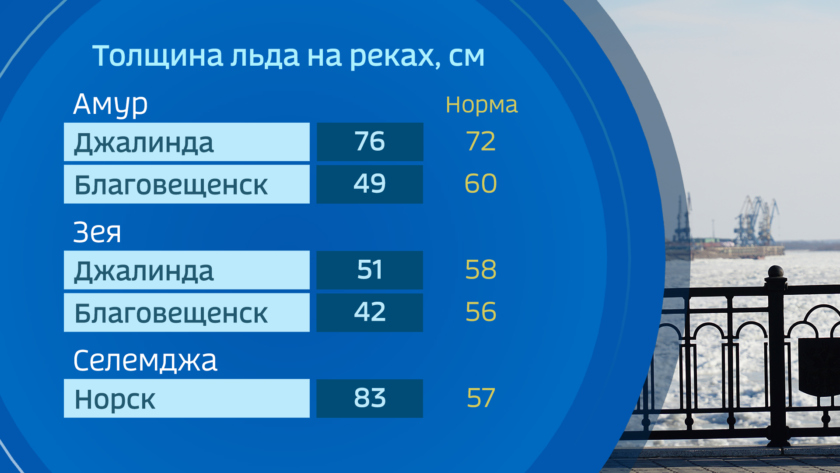 Ледостав установился на всех малых и основных реках, за исключением участков рек в непосредственной близости к Гидроэлектостанциям. На Амуре толщина льда от 76 сантиметров в районе села Джалинда, до 28 сантиметров в Иннокентьевке в Архаринском районе.