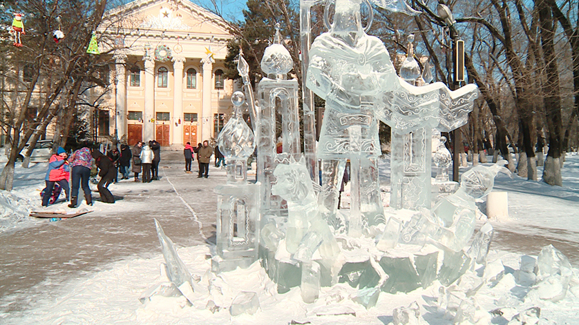 Рёв пилы и звуки работы стамеской все выходные были слышны в сквере областного Дома народного творчества. За несколько дней участники конкурса «Волшебный лёд Амура» из прозрачных плит создали фигуры птиц, зверей и даже пришельцев. За процессом наблюдала Мария Гумлевая.