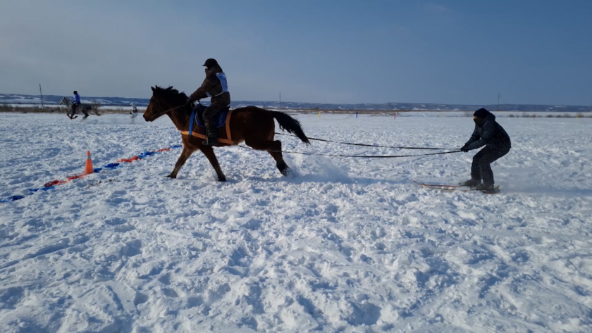 На лыжах через трамплин с поводьями в руках. Соревнования по скиджорингу прошли в селе Игнатьево. На старт вышли спортсмены нескольких конных клубов Приамурья и курсанты ДВОКУ.
