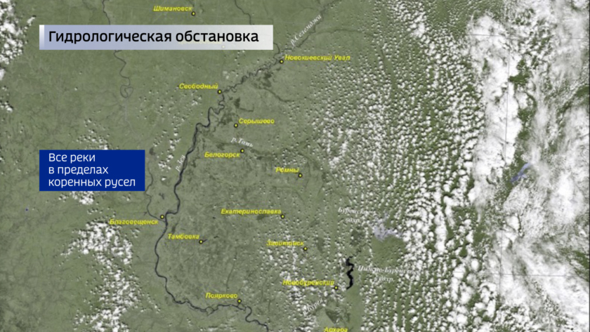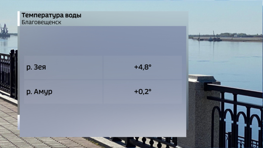 Температура воды в реках от ноля до 4 градусов тепла, максимально вода прогрелась на реке Зея в районе города Благовещенск — почти 5 градусов.