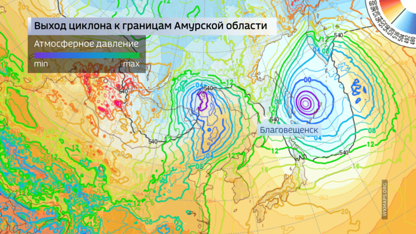 Поскольку течение основных ветров располагается гораздо южнее, на широте Корейского полуострова циклон малоподвижен и будет формировать погодные условия всю неделю. Устойчивой погоды не ожидается, весь период местами по области дожди различной интенсивности. В конце недели циклонический вихрь постепенно сместится к акватории Японского моря и там получит дополнительную морскую влагу. В Хабаровском крае пройдет сильный дождь, есть вероятность сильных осадков и на крайнем юго-востоке Амурской области.