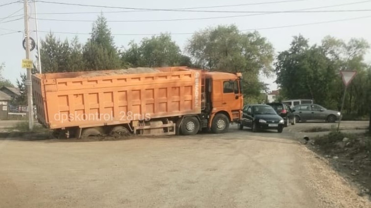 На дороге застрял многотонный КАМАЗ: колёса машины ушли под землю.