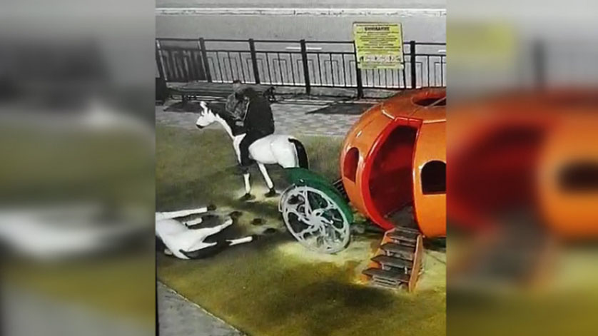 Компания посетила площадку около 01:00, хулиганы попытались забраться на фигуру лошади, но в итоге уронили и повредили конструкцию. Третий молодой человек снимал все происходящее на мобильный телефон.