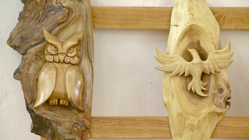 «Нечаянно попалась чурка на глаза, которую распилили. Я внутрь посмотрел, что там такое. А там сказка! Самое главное для меня был рисунок дерева! У меня очень долго стояли все эти срезы дерева, очень красивое! Я не знал, как их подать, но потом уже. Я взял и сделал топорище для топора. Покрыл лаком. Красивое такое, узорное такое», — рассказал автор выставка Николай Налимов.