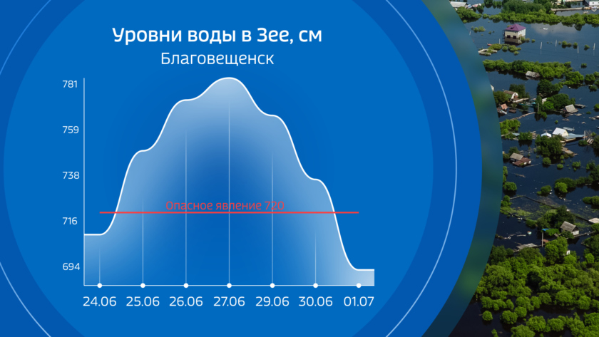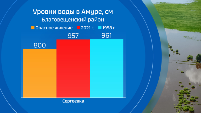 Уровень воды в селе Сергеевка поднялся до отметки 957 см 27 июня, не дотянув до отметки 1958 года всего 4 сантиметра. Но эти 4 сантиметра не спасли от затопления почти весь Благовещенский район, учитывая, что и ниже по течению в столице Амурской области вода поднялась на 60 см выше отметки опасного явления.