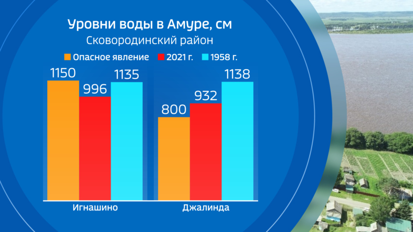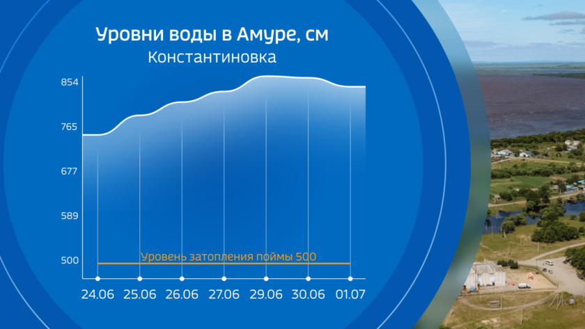 А по Амуру паводок скатывался далее по течению. После села Гродеково уровень воды в Амуре опасной отметки достиг только в районе села Поярково. В районе Константиновки, благодаря дамбе, отметка опасного явления высокая: 950 см, и вода до нее не дошла. Однако уровень достиг неблагоприятного явления и на 1,5 метра его превысил, а пойма, на которой большое количество населенных пунктов, была затоплена на глубину более 3,5 метров.