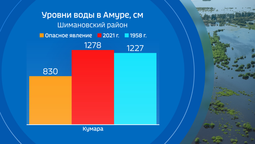 В Шимановском районе амурский паводок 2021 года стал самым высоким за 150 лет. Уровень в районе Кумары поднялся до отметки 1278 см, перекрыв уровень 1958 года на 51 сантиметр.