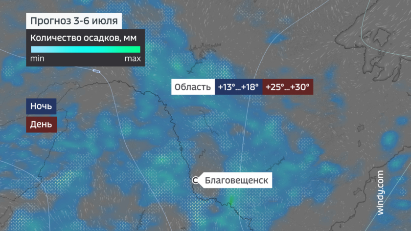 Серьезных циклонов в Забайкалье и Приамурье не ожидается, однако атмосфера неустойчива и локальные грозовые дожди различной интенсивности не исключены. Осадки, связанные с масштабными погодными условиями и которые можно спрогнозировать, ожидаются слабыми и умеренными. Температурный фон стабильный: 13-18 градусов тепла в ночное время суток, 25-30 при ясном небе и 20-25 в дожде.
