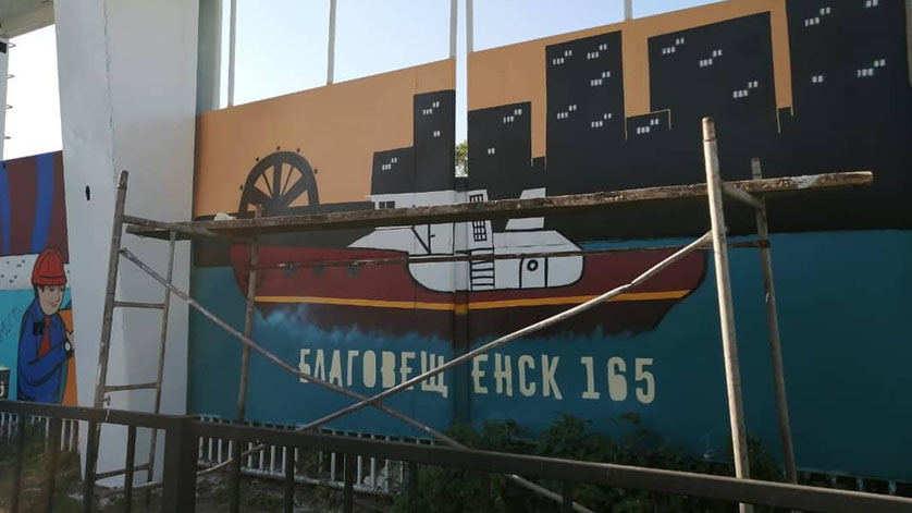 Работников одного из старейших предприятий города, а также судно, идущее по Амуру, изобразили на ограждении судостроительного завода на ул. Пушкина, 189 творческая команда художника Максима Кузнецова-Мельникова. Он, напомним, победил в конкурсе на предоставление муниципального гранта в области молодёжной политики с проектом «Арт-Благ». В его рамках при поддержке городского отдела по делам молодёжи организовали стрит-арт фестиваль. Начало положено в июне и посвящено 165-летию Благовещенска. Теперь на ограждении молочного комбината разлились молочные реки, гуляют коровы и красуются элементы фирменного стиля организации. У Амурагроцентра стены украшают трактора и сельхозугодия, а девушка с энергией в руках появилась на здании Благовещенской ТЭЦ.