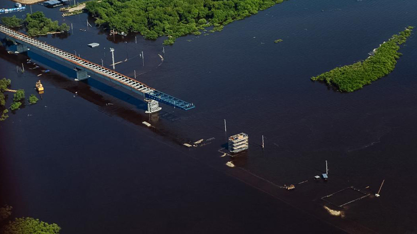 Как сообщил руководитель подрядной организации, с 21 июня все силы были приложены на противопаводковые мероприятия. Работать можно было только на правом берегу, поэтому вахту сократили. Возобновилось строительство переправы с 7 июля. Левый берег до сих пор подтоплен, грунтовые воды ещё на высоком уровне, что не позволяет соорудить здесь насыпь. Тем не менее, темпы работ наращиваются. На объекте трудятся 800 человек, привлечено 155 единиц техники. Установили баржи на опоре №8 и №9. Кроме этого выполнили третий этап надвижки левобережной части пролетного строения — на 84 метра.