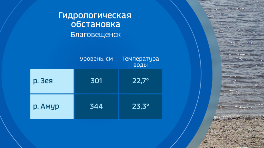 Уровни воды Амура и Зеи сохраняются выше декадной нормы на 70-160 см, Селемджи — на 100-210 сантиметров. В ближайшие двое суток на Амуре ожидается подъем уровней воды на 10-60 см за сутки, Зеи от поселка Поляковский в Зейском районе до устья — на 20-60 см за сутки, без выхода воды на пойму.