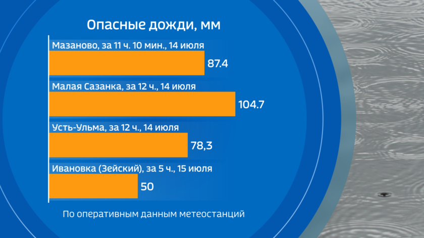 Во вторник после полудня в селе Новоалександровка Тамбовского района наблюдалось значительное шквалистое усиление ветра с серьезными повреждениями построек, электрических линий и деревьев. В Мазановском и Серышевском районах прошли дожди в критериях опасного природного явления. Так, в селе Малая Сазанка Серышевского района в ночь на четверг на каждый квадратный метр поверхности почвы вылилось 105 литров дождя, в Мазанове более 80 литров.