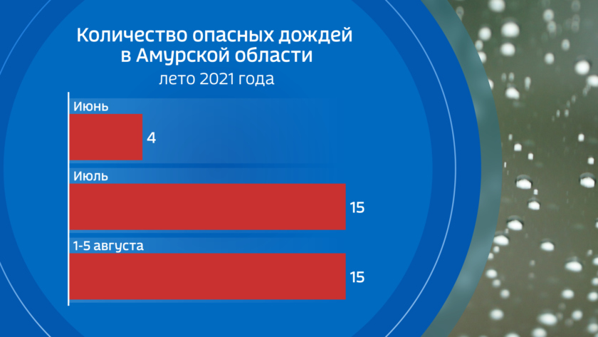 Статистика летних дождей в критериях опасного метеорологического явления следующая: за 5 дней августа в Амурской области уже зафиксировано 15 опасных дождей. В июле их количество за месяц(!) составило 15, в июне всего 4.