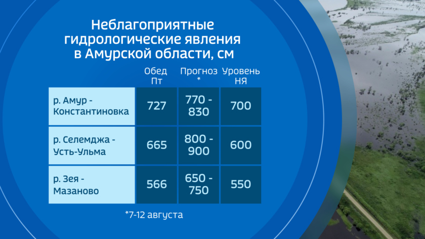 Гидрологическая обстановка на территории области крайне тяжелая. По данным на утро пятницы, на реках Зея, Селемджа, Томь, Бысса, Завитая, Бурея, Берея, Голубая, а также на Амуре от водпоста Кумара в Шимановском районе и ниже до крайних южных границ области пойма затоплена на глубину до 230 сантиметров. В четверг на реках области начали фиксировать первые опасные уровни. На реке Амур в районе села Иннокентьевка Архаринского района, на Томи в районе города Белогорск и на реке Завитая в районе села Михайловка уровни воды превысили отметки опасного гидрологического явления.