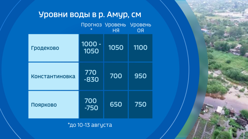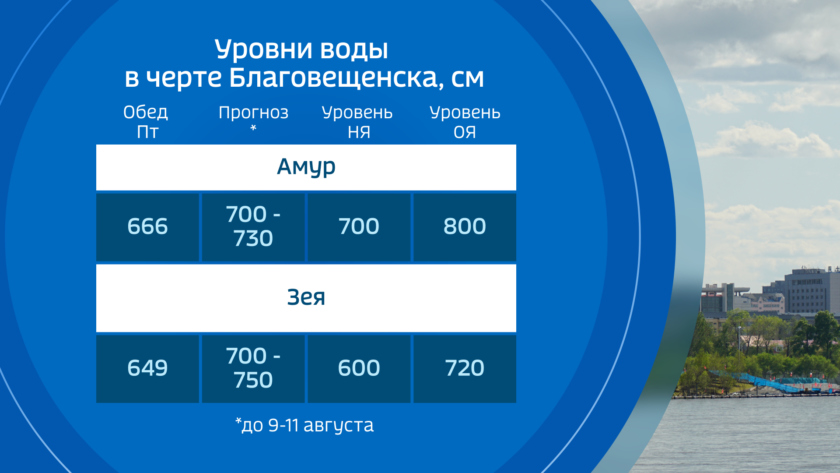 В черте города Благовещенск поймы Амура и Зеи затоплены на глубину 1,5-2 метра. Уровни рек медленно растут. В 12 часов дня пятницы уровень Амура составил 666 см, что на 34 см ниже отметки неблагоприятного явления. В период 9-11 августа ожидается повышение уровня до отметок 700-730 см. Уровень неблагоприятного явления 700 см. Уровень Зеи к 12 часам пятницы поднялся до 649 см, превысив отметку неблагоприятного явления на 49 см. До среды ожидается повышение уровня воды 7-7,5 метров, что превысит отметку ОЯ на 20-30 см.