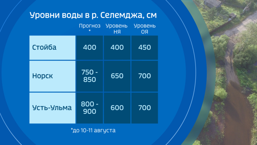 Гребень селемджинского паводка в пятницу проходил у с. Стойба, уровни воды выше поймы на 61-79 см. По прогнозам, в нижнем течении реки 7 августа повышение уровней на 50-100 см. К началу следующей недели — с превышением отметок опасного гидрологического явления.