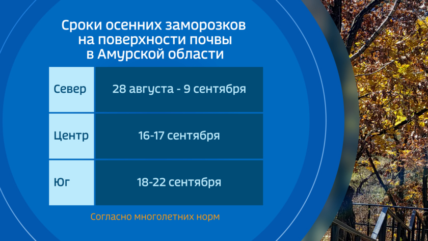 Согласно многолетним нормам, средние даты наступления заморозков на поверхности почвы в центральных и южных районах области приходятся как раз на этот период — с 16 по 22 сентября. В прошлом году из-за довольно теплого начала осени сезон осенних заморозков был открыт в ночь на 7 октября. Тогда минусовые температуры были зафиксированы практически во всех районах. Самые поздние заморозки фиксировались в 2009 году. Тогда они наступили в ночь на 15 октября.