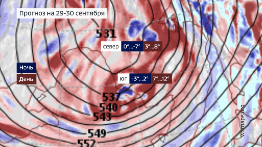 Днем заток холодной воздушной массы усилится. Местами на севере области сохранятся осадки в виде дождя и мокрого снега. Скорости северо-западного ветра составят 10-13 м/сек. Температурный фон продолжит понижаться, и в северных районах ожидается 6+11, по крайним районам около 0. На юге области 13-15 градусов тепла.