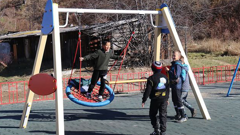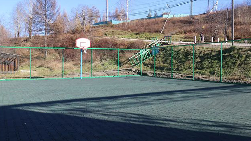 Территория имеет две зоны: одна для детей помладше, где есть детский комплекс, качели и скамейки, другая — для тех, кто постарше, на ней обустроено баскетбольно-волейбольное поле.