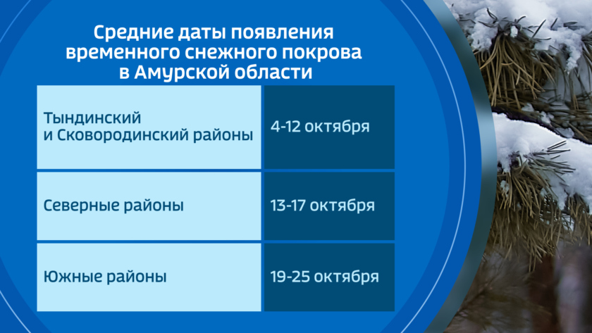 Нормативно средние даты появления временного снежного покрова в Амурской области растягиваются на весь октябрь — на севере области они приходятся на вторую декаду месяца, в южных районах — на третью. А в Тындинском и Сковородинском районах этот период наступает с 4 по 12 октября.