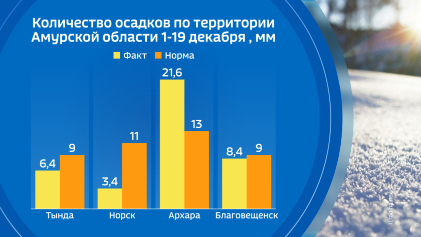В условиях климата юга Дальнего Востока зима в Амурской области, несмотря на распространенное мнение, довольно бесснежная и климатические нормы небольшие. В этом году с начала декабря осадки распределились крайне неравномерно, и если в Архаре к 20 числу норма осадков перевыполнена с лихвой, то в Норске Селемджинского района снега выпало чуть больше 30 процентов от нормы месяца. В Благовещенске количество осадков, с учетом снега в понедельник, в пределах нормы.