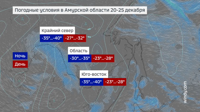 Весь период в Амурской области без существенных осадков. Ветер слабый, северный, северо-западный. Температура ночью на большей части области, включая областной центр, 30-35 градусов мороза, местами по крайним северным и юго-восточным районам до 40. Днем не выше 23-28 ниже ноля, в самых северных районах около 30.