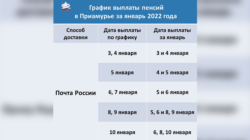 Для амурчан, получающих деньги через отделения почты, выплаты будут производится с 3 по 20 января, за исключением 7 числа — выходной праздничный день. Те, у кого дата пенсии совпадает с этим днём, получат их 5 и 6 января. В остальные дни процедура будет производится по графику или раньше.