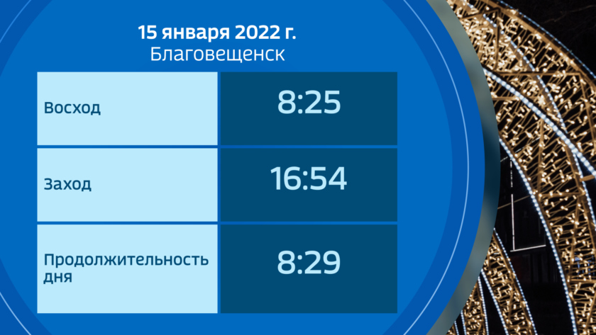Восход солнца в субботу, 15 января, в 8-25, заход в 16-54, продолжительность светлого времени суток 8 часов 29 минут, с начала года она увеличилась на 22 минуты.
