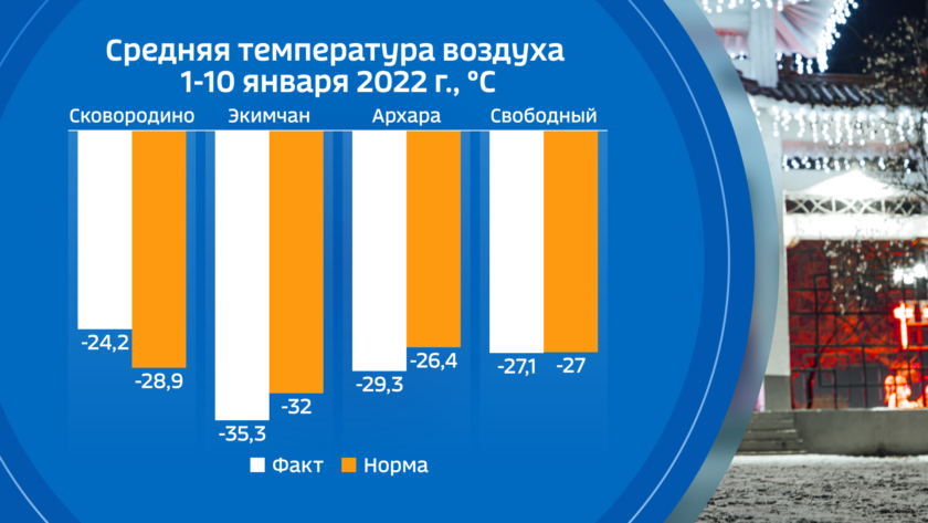 В первую декаду января мороз амурчан особенно не мучил, а в западных районах и вовсе было теплее обычного. В целом средняя температура декады на юге области была ниже нормы до полутора градусов, и только в Архаринском районе было очень холодно — ниже нормы почти на 3 градуса. А вот на северо-западе средняя температура существенно превысила климатические нормы и наибольшее отклонение от нее замечено в городе Сковородино — теплее обычного почти на 5 градусов.