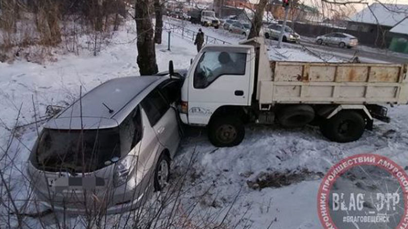 В Благовещенске микрогрузовик прижал легковушку к дереву