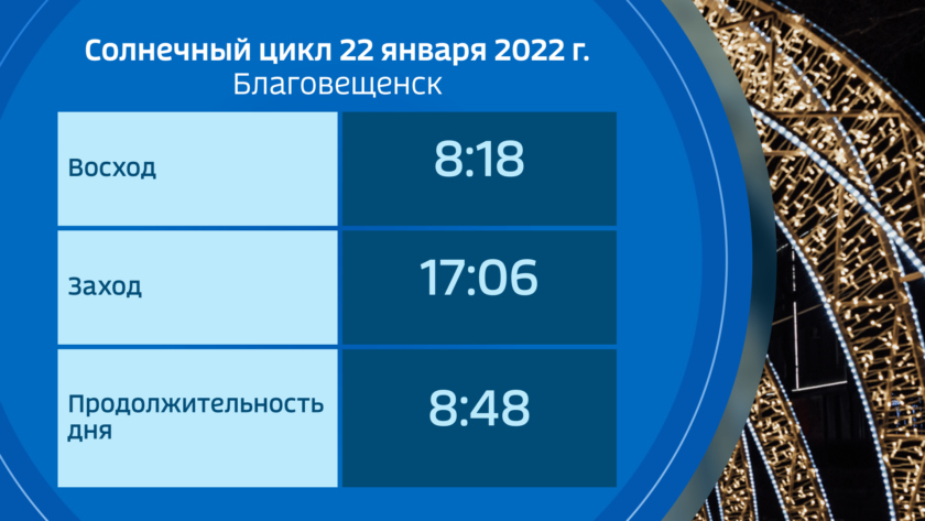 Восход солнца в координатах Благовещенска в субботу, 22 января, в 8:18, заход в 17:06, продолжительность светлого времени суток 8 часов 48 минут. За прошедшую неделю день увеличился на 19 минут.