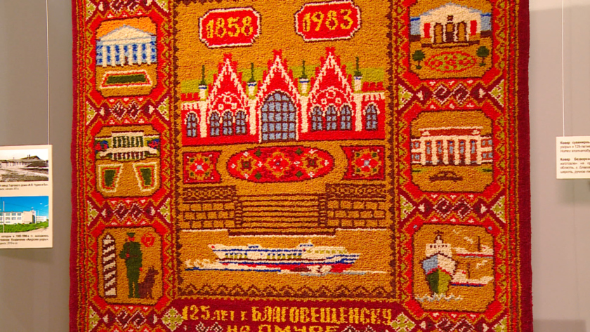 Шерстяной путеводитель — ковер 83-го года изготовлен на «Амурских узорах» к 125-летию Благовещенска. На стене краеведческого музея он соседствует почти со сверстником, посвященным строительству Зейской гидроэлектростанции. Впервые выставлен ворсовый ковер с изображением Ленина в 8 квадратных метров.