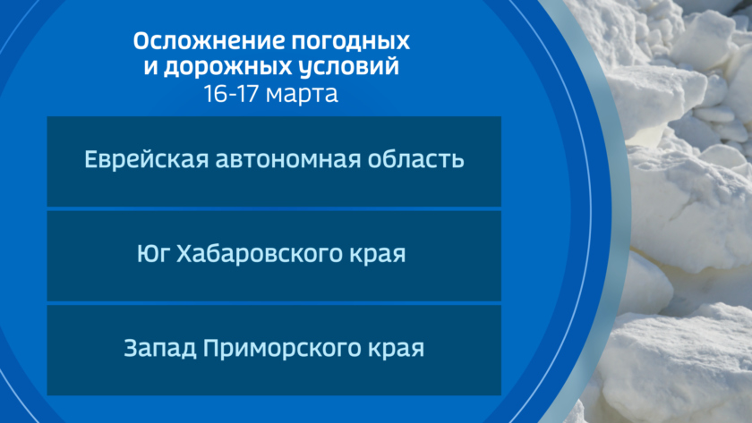 Также хотелось бы отметить, что в период 16-17 марта осложнение погодных и дорожных условий ожидается у наших восточных соседей — в Еврейской автономии, на юге Хабаровского края и по западным районам Приморья. По возможности скорректируйте ваши планы, если они связаны с посещением этих районов.