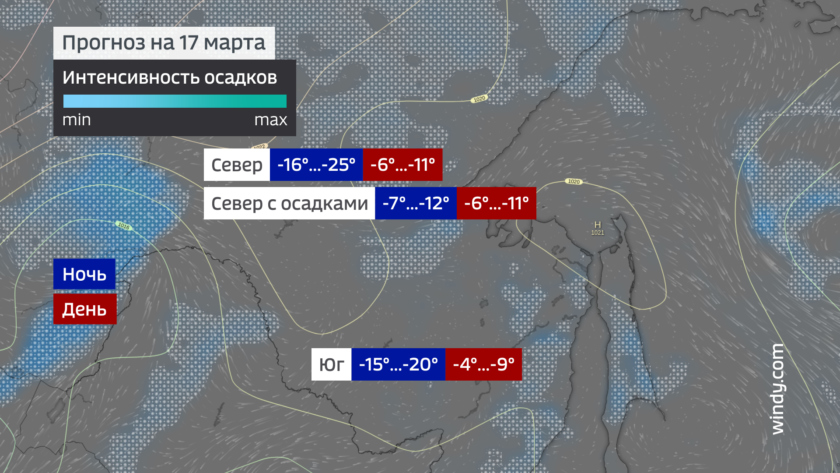 Ветер сменит направление на северо-западное, в порывах местами достигнет 15-17 м/сек. Спутниками непогоды станут поземок и слабая метель. Ночные температуры составят на севере минус 7-12, в южных районах 4-9 градусов ниже ноля. Днем на севере минус 2-7, на юге 0 минус 5 градусов.