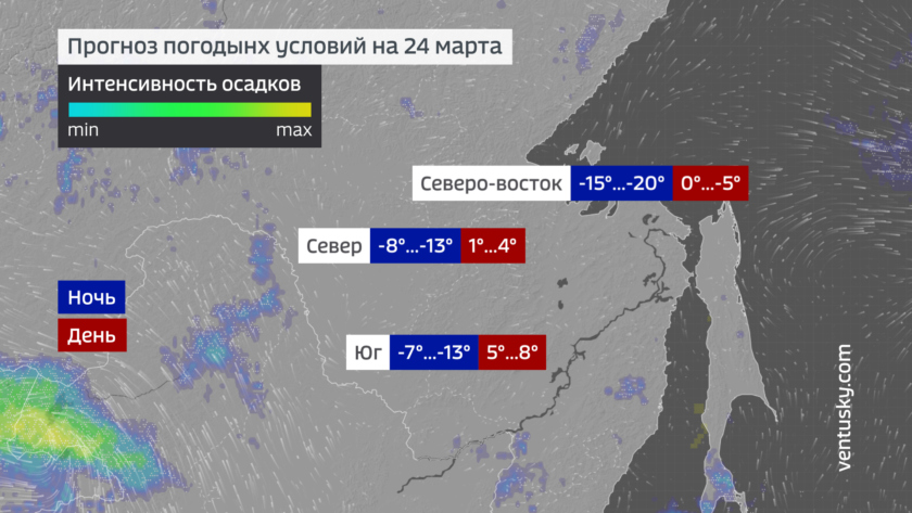 В четверг, с приближением циклона, ветер сменит направление на южное и будет слабым. Небольшой мокрый снег возможен лишь местами на северо-западе — в Тындинском, Сковородинском, Магдагачинском районах, куда уже начнет натекать облачность фронтальных разделов циклона. Ночью в западных районах области термометры покажут около минус 10 градусов, на востоке сохранится 15-20 мороза. Днем по области будут преобладать положительные температуры — на севере воздух прогреется до плюс 2-4 градусов, на юге ожидается до 8 градусов тепла. И лишь по крайним северным районам от 0 до минус 5.