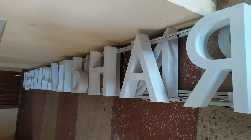 С помощью строительного крана рабочие поднялись на высоту около 10 метров, чтобы аккуратно открепить от фасада искусную работу чеканщика Игоря Сасима. Конструкцию, Панно, состоящее из трёх частей, впервые почти за 37 лет покидает своё место. После очистки металл чеканки покроют защитным средством и установят на уже отремонтированный фасад. Буквы вывески библиотеки «Центральная» тоже сняли – они также ждут своего возвращения на прежнее место.