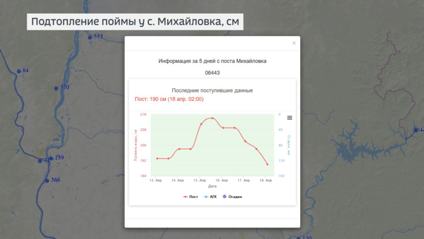 У села Михайловка на реке Завитая уровень воды за сутки упал на 12 сантиметров и по состоянию на 8 утра 18 апреля на 10 см выше отметки затопления поймы, что является обычным делом в период начала вскрытия рек. Максимально уровень воды поднимался до 214 сантиметров 15 апреля, превысив отметку затопления поймы на 34 сантиметра.