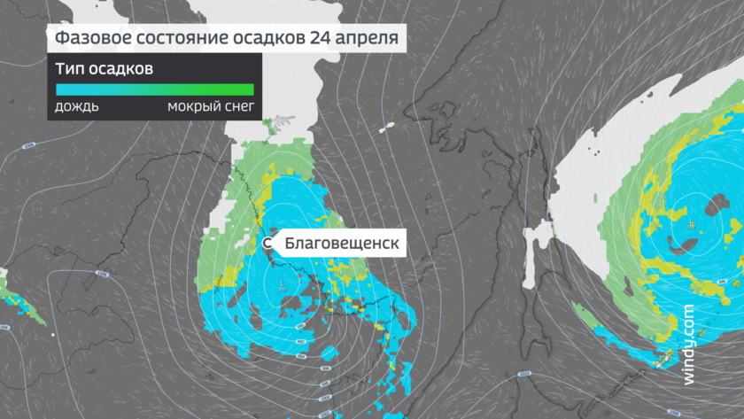 Что касается фазового состояния осадков, то на большей части территории они пройдут дождем, местами по северу мокрым дождем, на севере Зейского водохранилища довольно плотным.