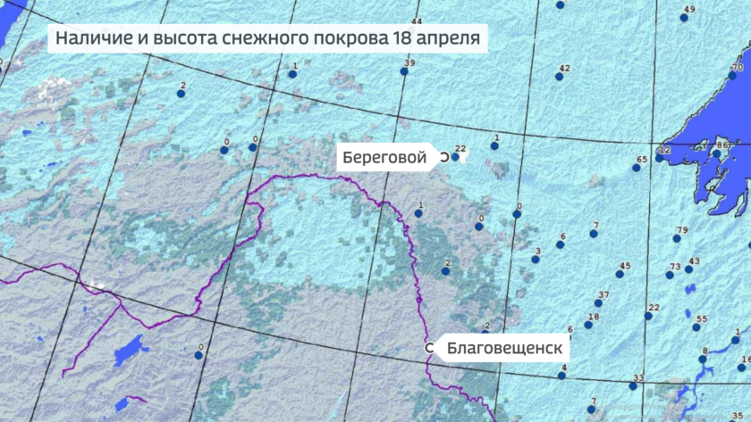 Несмотря на середину апреля, местами по северу области еще лежит снег. Высота снежного покрова, при его наличии, 2-7 см. Самое высокое залегание снега высотой 22-26 см сохраняется в п. Береговой Зейского района, а также в целом на северном побережье Зейского водохранилища.