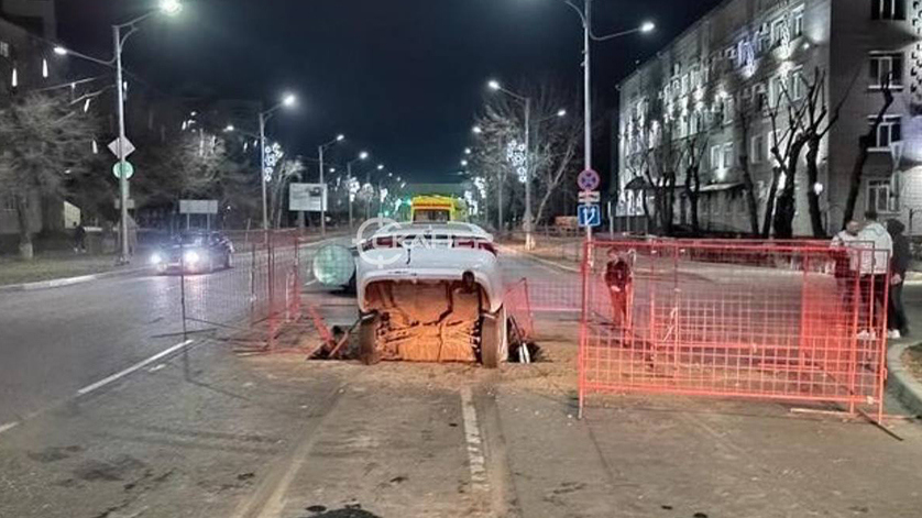 Сообщение о происшествии в дежурную часть поступило 19 апреля в 22:42. Как видно на фотографии, машина наполовину ушла в разрытый участок. Очевидцы утверждают, что место проведения работ не было огорожено и освещено.