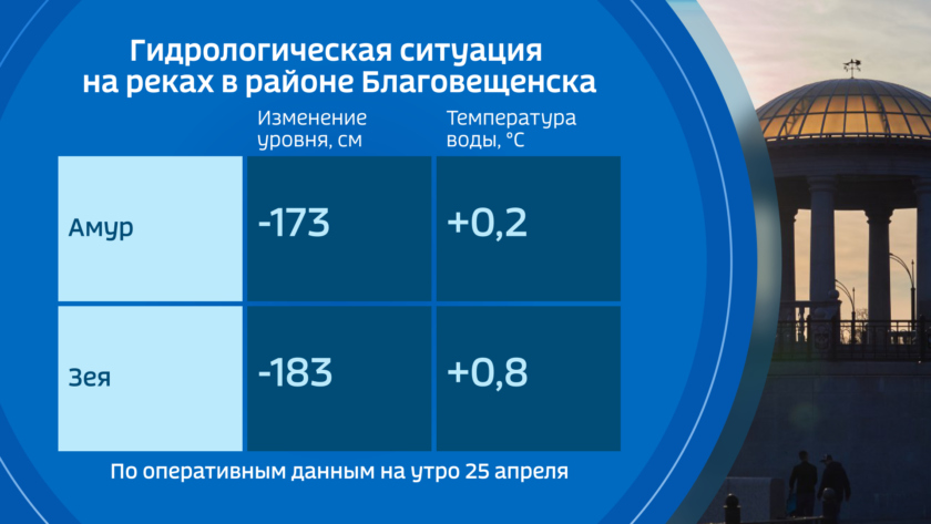 В районе города Благовещенска уровень Амура за сутки упал на 173 см и сейчас находится ниже нормы на 33 см. Температура воды 0,2 градуса. На реке фиксируются подвижки льда и разводья. Уровень Зеи за сутки упал на 183 см, и сейчас ниже нормы на 27 см. Температура воды 0,8 градуса. На реке наблюдается ледоход, дрейф льда 2 балла и навалы льда на берегу.