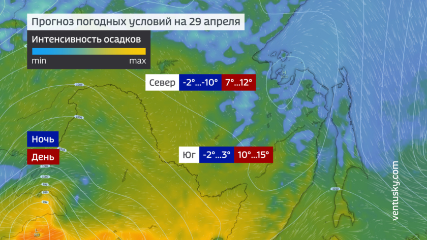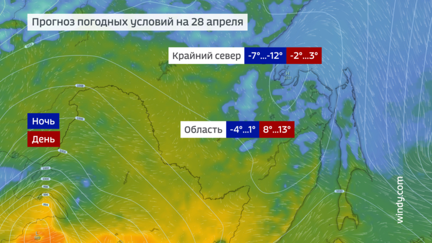 На высоких термобарических контрастах смещение фронтальных систем циклона будет сопровождаться сильным порывистым ветром, скорости которого достигнут 15-20 м/с. Что касается температуры воздуха, то на севере области ночью 0 минус 5, по крайним районам в отсутствии облачности выхолодит сильнее — здесь около 10 градусов мороза. Днем столбики термометров поднимутся до плюс 5-10 градусов. В центральных и южных районах, а также на северо-востоке в облачности ночью ожидается около 0. Днем до плюс 5-7 градусов, в осадках около 0.