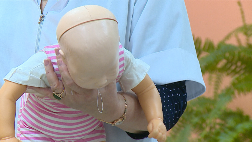 «Мы его усаживаем на предплечье, опускаем как можно ниже голову и наносим в межлопаточную область посылающие удары. Хорошо, чтобы ребеночек кашлял. И мы наносим пять ударов», — рассказывает преподаватель основ реанимации и медицины катастроф Амурского медколледжа Раиса Овечкина.