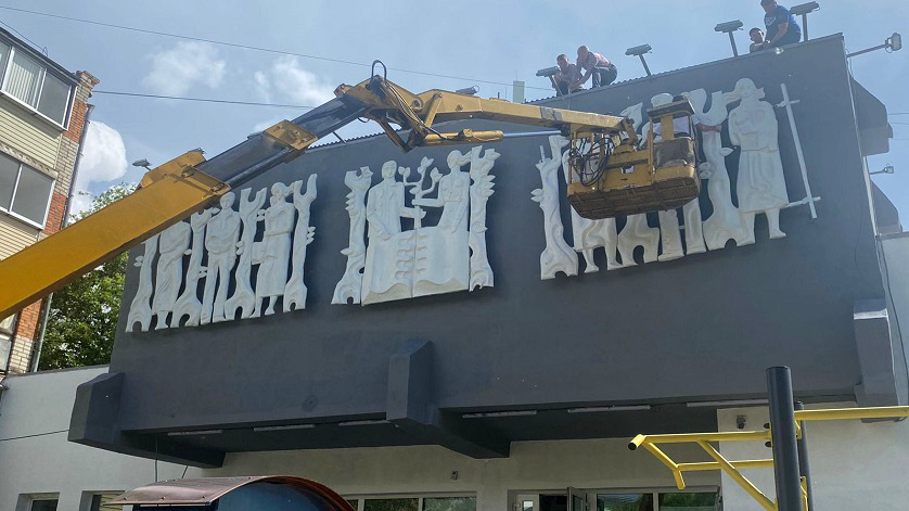 Чеканное панно сняли 8 апреля, перед началом ремонта фасада, который очистили от старой штукатурки и подготовили к новому покрытию. Сейчас «лицо» библиотеки преобразилось, здание оформили в сдержанной гамме: фоновый цвет – белый, акцентный – серый, им выделена верхняя часть фасада, на которой расположены элементы декора, включающие чеканку и название библиотеки. Вскоре заработает и система подсветки, включающая в себя 66 прожекторов и светильников.