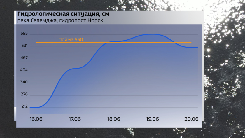 Накануне самым неспокойным местом на территории области являлся бассейн реки Селемджа. После прошедших дождей на прошлой неделе в Селемджинском районе, уровень воды в реке Нора поднялся на 4 с лишним метра, кроме того существенно вырос уровень самой Селемджи. В результате паводка Селемджа вышла на пойму в районе села Норск и к 19 июня затопила ее на глубину 45 сантиметров. По состоянию на 8 утра 20 июня уровень воды у Норска упал на 70 сантиметров, уровень ниже отметки поймы.