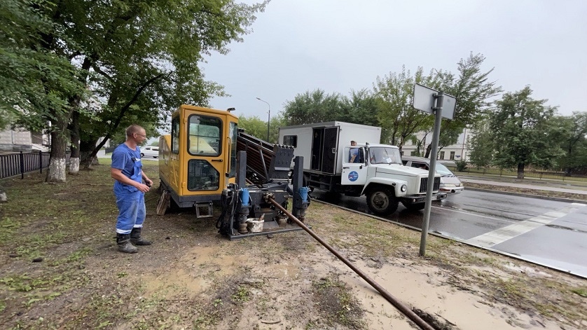 Все эти работы – они проводятся в районе перекрёстка улиц Горького и Шевченко – обойдутся без рытья траншеи. Землю вскроют только в местах входа и выхода. Поэтому перекрывать движение автомобилей не потребуется.